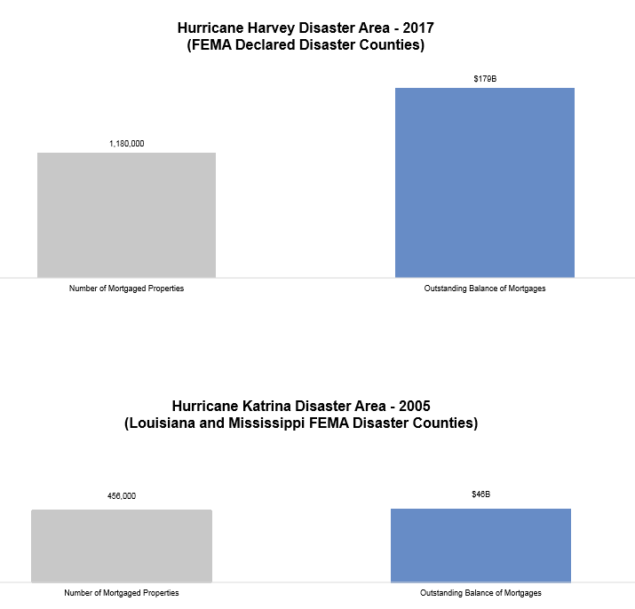 • FEMA-designated disaster areas in southeast Texas associated with Hurricane Harvey have over twice as many mortgaged properties as Katrina’s FEMA-designated disaster areas, carrying nearly 4x the unpaid principal balance.