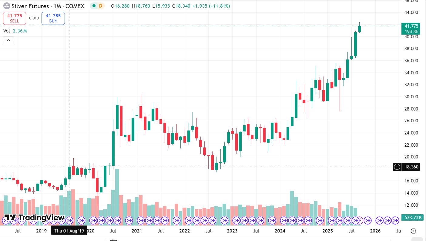 Here’s a silver futures chart back from 2019 through present. Other than a few oddball months, silver has been well above $18 for a looooong time now. (currently at $41.77)