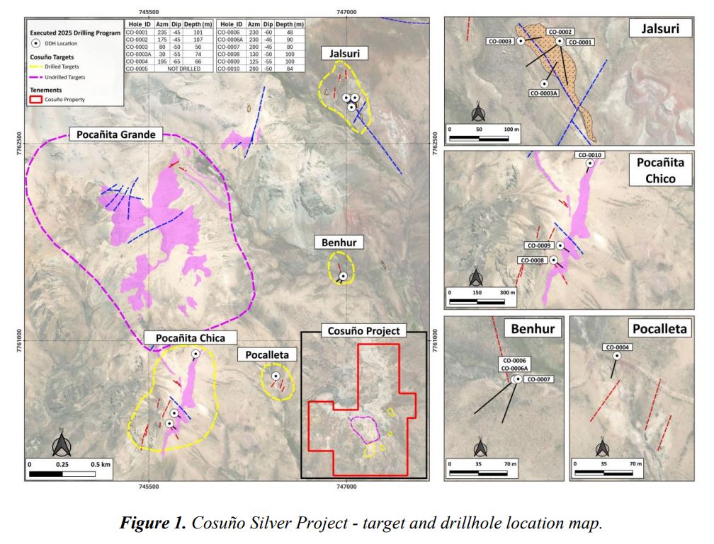 Next we get into the details announced on December 17th, highlighting the successful completion of its Phase 1 diamond drilling program at the Cosuño Silver Project, located in the Department of Potosí, Bolivia. A total of 11 diamond drill holes totaling 906 meters were completed, testing four high-priority targets in the lithocap that may host an epithermal silver deposit. Samples from the first two drill holes have been submitted to an independent geochemical laboratory for analysis. Final core logging, sample preparation, and shipment of the remaining samples will be completed prior to the conclusion of the program later in December, with initial assay results expected in early January 2026.