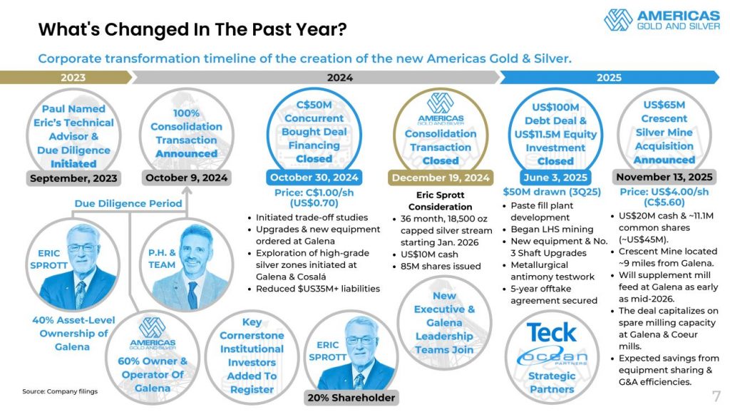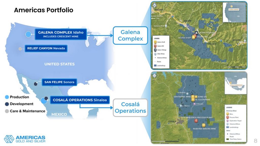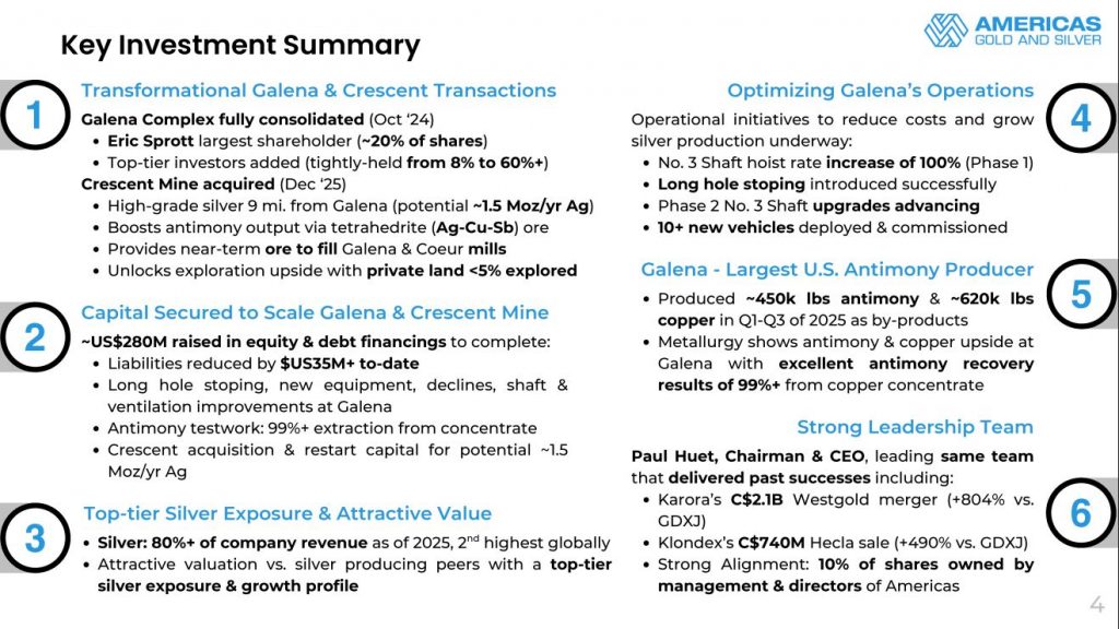 Next we discussed the big news out today on December 12, that the Company has closed the acquisition of Crescent Silver, LLC, which owns the Crescent Mine in Idaho. The consideration under the Acquisition is made up of US$20 million in cash and approximately 11.1 million common shares of Americas Gold and Silver. The Crescent Mine is a synergistic addition located just 9 miles from the Galena Complex, and is a fully permitted past producing mine which will be advanced for a restart in 2026. The Crescent Mine will provide a supplementary high-grade source of feed to their 2 mills at Galena, further utilizing processing capacity. The mineralized material at Crescent is very similar to the tetrahedrite material at Galena which contains high grade Silver and significant by-product potential from antimony and copper, which meshes perfectly with their strategy to maximize the production value across all metals.