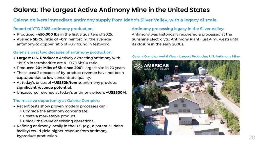 Throughout 2025, there has been very promising metallurgical testing, confirming high recoveries of antimony alongside strong silver and copper recoveries from ore currently being processed. Until recently the company was not getting paid for antimony or copper, but that will be changing in 2026 based on a new off-take agreement signed with Ocean Partners USA Inc. for treatment of up to 100% of the concentrates from the Company’s Galena Complex at Teck Resources Limited’s Trail Operations in Trail British Columbia; one of the world’s largest fully-integrated zinc, lead and critical metals complexes.